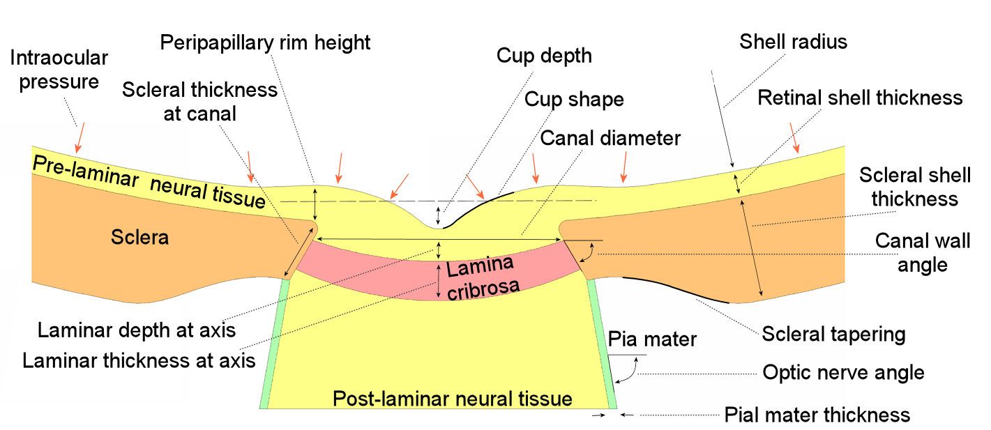 Schematic cross-section through a human eye. Light enters the eye through the cornea, passes through the pupil, lens and vitreous humour and strikes the retina, where it is absorbed. Retinal nerve fibers transmit visual information to the brain. These fibers converge at the optic nerve head region, exit the eye through the scleral canal, and form the optic nerve. The lamina cribrosa is a porous structure spanning the scleral canal. The vitreous chamber is filled with the vitreous humor, which exerts a pressure, the intraocular pressure, on the surface of the retina. [Sigal et al. Biomech Model Mechanobiol, 8(2):85-98, Apr 2009] (adapted from an illustration from NIH) |
