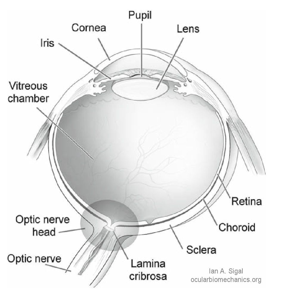 Schematic cross-section through a human eye. Light enters the eye through the cornea, passes through the pupil, lens and vitreous humour and strikes the retina, where it is absorbed. Retinal nerve fibers transmit visual information to the brain. These fibers converge at the optic nerve head region, exit the eye through the scleral canal, and form the optic nerve. The lamina cribrosa is a porous structure spanning the scleral canal. The vitreous chamber is filled with the vitreous humor, which exerts a pressure, the intraocular pressure, on the surface of the retina. [Sigal et al. Biomech Model Mechanobiol, 8(2):85-98, Apr 2009] (adapted from an illustration from NIH) |